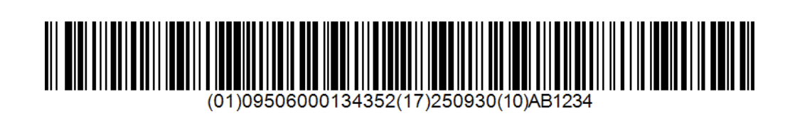 An example GS1-128 Linear (1D) barcode that captures the GTIN (09506000134352), Batch (AB1234) and expiry (250930)